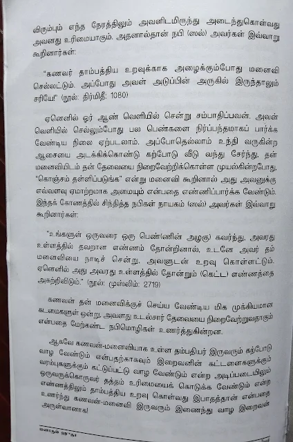 காலம் முழுக்க வாழப்போகின்ற வாழ்க்கையில் மனைவி-கணவன் பிரிக்க முடியாத அங்கம். ஆனால் அவள் நம்மிடம் பேசாமலோ நம்மைவிட்டுப் பிரிந்து தனியாக வாழ நேரிட்டாலோ அது அவளுக்கும் தொல்லை, நமக்கும் தொல்லை. அவளைக் கண்டித்துத் திருத்த முனைந்தால் அதை ஏற்றுக்கொள்ளும் பக்குவம் அவளுக்கு இல்லை. எதிர்த்தே பேசிக்கொண்டிருக்கிறாள். இந்த நேரத்தில் சகித்தல் என்ற நற்குணம்தான் அக்கணவனுக்குப் பயனளிக்கும். அதனால்தான் அல்லாஹ்வின் தூதர் ஸல்லல்லாஹு அலைஹி வஸல்லம் இவ்வாறு கூறினார்கள்: பெண் (வளைந்த) விலா எலும்பைப் போன்றவள் ஆவாள். அவளை நீ (ஒரேயடியாக) நிமிர்த்தப்போனால் அவளை ஒடித்தே விடுவாய். அவளை (அப்படியே) நீ விட்டுவிட்டால், அவளிடம் கோணல் இருக்கவே அவளிடம் அனுபவிக்க வேண்டியதுதான். (நூல்: திர்மிதீ: 1109)