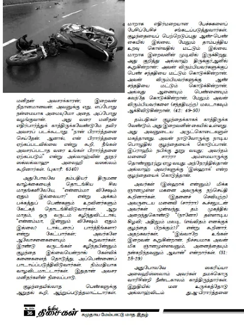 கணவன்-மனைவி இடையே பிரச்சனை என்றால், அந்தப் பிரச்சனையைப் பொறுமையாக எதிர்கொள்ள வேண்டும்; பேசித் தீர்க்க முயலவேண்டும். அதை விட்டுவிட்டு இருவருள் ஒருவரோ, இருவருமோ அவசரப்பட்டுத் தவறான முடிவெடுத்துவிடக் கூடாது. அவசரப்பட்டு, மணமுறிவு வரை சென்றுவிடக் கூடாது. அல்லது தற்கொலை முடிவெடுத்துவிடக்